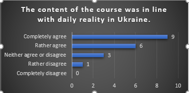 The participants agreed that the content of the course suited their level well and mostly all the participants found that the content fitted their prior knowledge. Only two of the nineteen participants neither agreed nor disagreed about it. The majority of the participants also found that the content of the course was in line with the daily reality in Ukraine. Three of the participants had no real opinion (neither agree nor disagree) and one participant did not agree with the majority. We believe that it is the task of the teacher to make the transition to the daily reality in Ukraine in order to make the content of the course accessible for Ukrainian students.