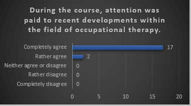 Despite that, all the participants mentioned that they learned new knowledge about occupational therapy during the course and eighteen participants said that they will integrate the course content in their own teaching practice. Moreover, all the participants agreed that the course paid attention to recent developments within the field of occupational therapy.