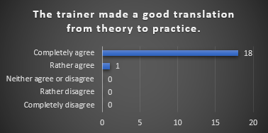 The participants were extremely positive about the trainer. They found that the trainer was able to keep their attention during the course and was open to questions and feedback. The trainer is seen as someone with sufficient professional knowledge and didactic skills to teach the course and someone who made good translations from theory to practice.