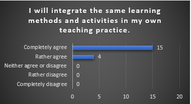 The course materials (syllabus and presentations) and the language used during the course were clear, and the participants saw the visual materials as an added value to the content of the course. There is also a consensus that the course was cohesive and had a logical structure. Furthermore, the participants indicated that the teaching methods were well-chosen and in line with the goals of the course. Not surprisingly, all the participants indicated that they would integrate the same learning methods and activities in their own teaching practice and almost all the participants indicated that the applied learning methods and activities were inspiring for their own teaching practice. Only one participant had no opinion.